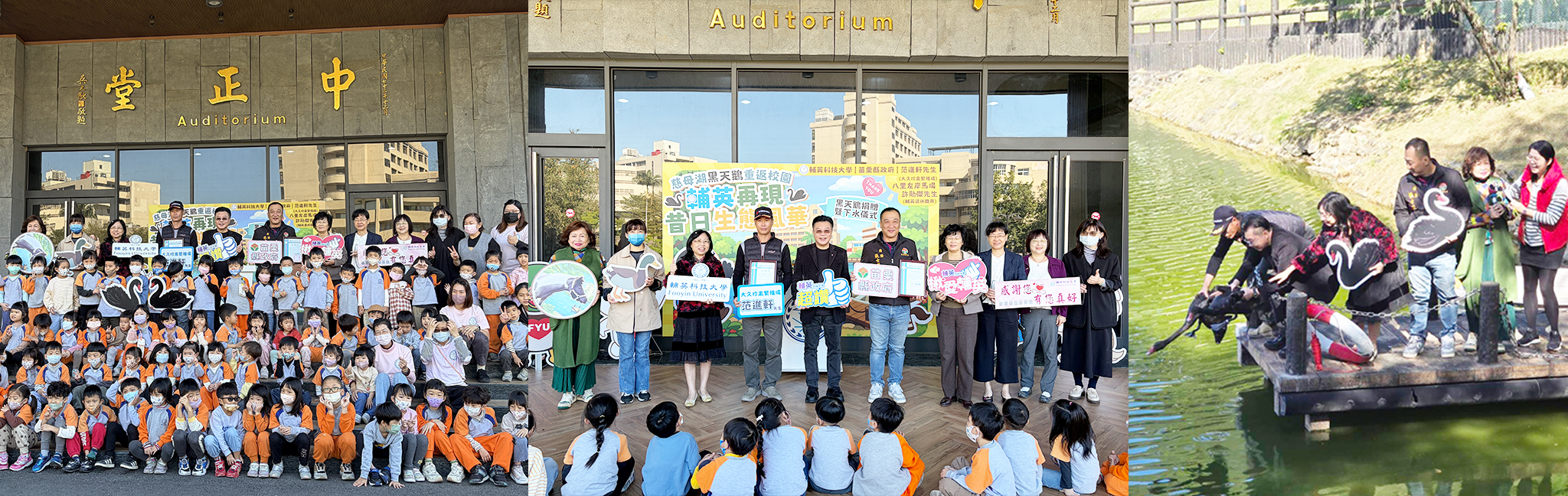 黑天鵝捐贈暨下水儀式於五日上午在中正堂舉行,由張可立董事長偕同林惠賢校長率領校內主管、終身名譽校友顧問徐麗月董事長、輔英附設幼兒園邱錦娥園長及全體師生,熱情迎接苗栗縣政府代表縣長特助張士能賢伉儷及大久珍禽繁殖場范進軒負責人,共同見證兩對珍貴黑天鵝加入輔英大家庭。儀式在附設幼兒園小朋友以純真的笑容與可愛表演下增添溫馨氣氛,現場洋溢喜悅與祝福。